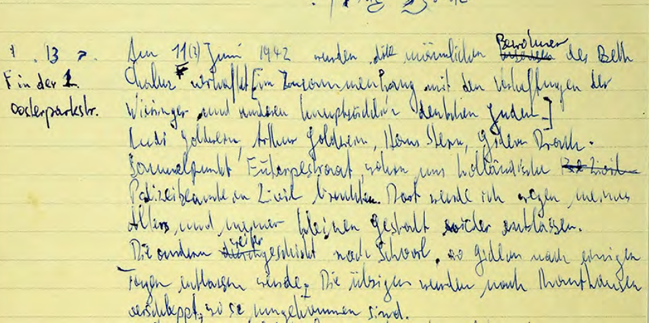 „Am Mittwochabend, dem 11. Juni 1941, besuchte ich mit Lotti in der Stadsschouwburg eine Aufführung von Griegs Oper „Per Gynt“. Es war eine schöne, angenehme Aufführung. Es war auch das letzte Mal, dass ich mit Lotti ausgegangen bin. Auf dem Heimweg trafen wir einige Freunde vom Werkdorp. Sie waren sehr aufgebracht und teilten uns mit, dass unsere Mitbewohner des Werkdorps noch am selben Abend von der Gestapo festgenommen worden seien.