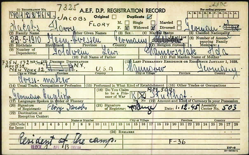 1.12.1945 Flory als DP im DP Camp Zeilsheim, Assembly Center 503 „Kibbuz Zeilsheim“