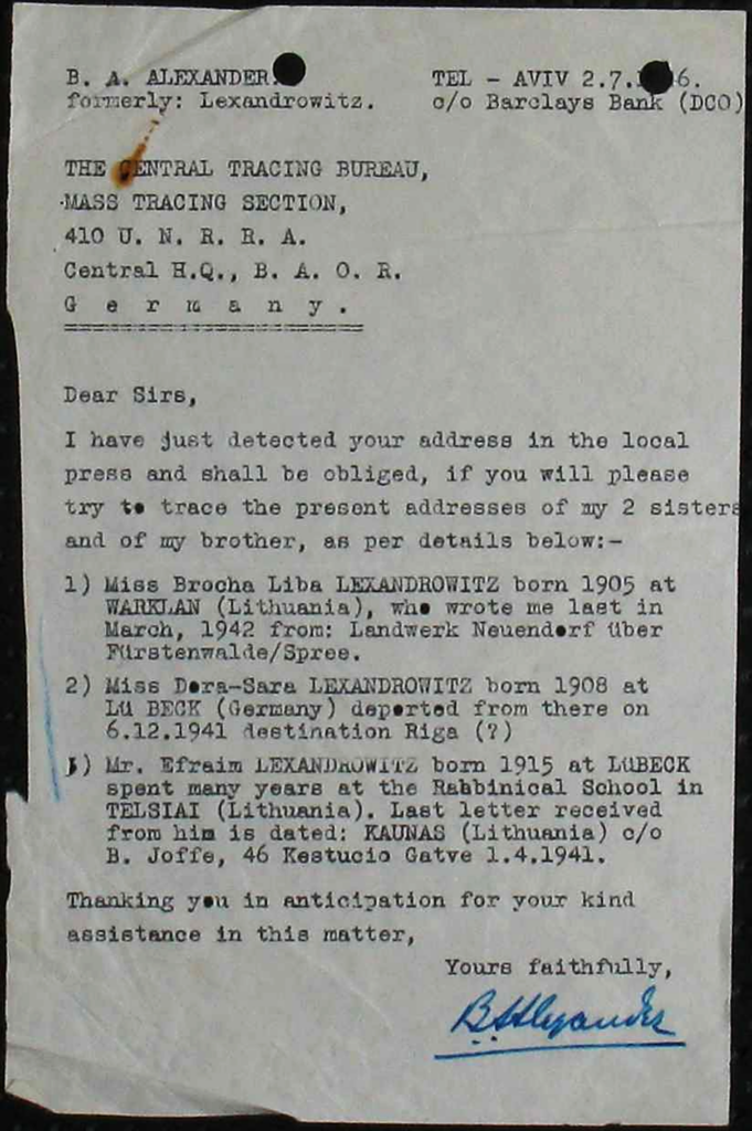 1946 Suchanzeige von B. A. Alexander/Baruch Lexandrowitz, Tel Aviv nach seinen Geschwistern Brocha, Dora und Efraim