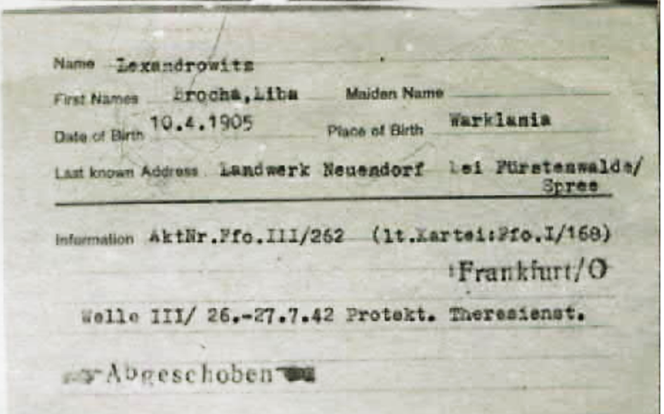 2.4.1942 Verhaftung der älteren und der bereits bei der Gestapo zuvor auffällig gewordenen Chaluzim aus Neuendorf und Deportation auf Lastwagen in das Sammellager, eine große Turnhalle am Leipziger Platz in Frankfurt/Oder
