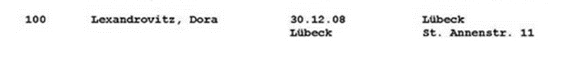 Dora Lexandrowitz *30.12.1908 in Lübeck; 1942 in Riga Jungfernhof