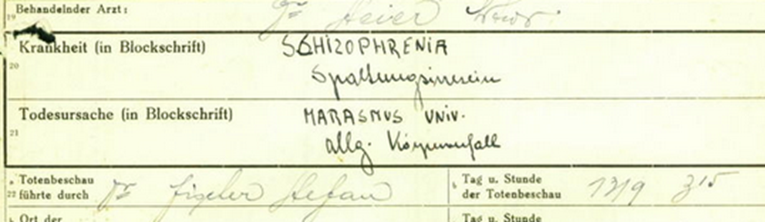 13.9.1942 Mutter stirbt in Theresienstadt; Diagnosen Schizophrenie, Marasmus, allgemeiner Körperverfall