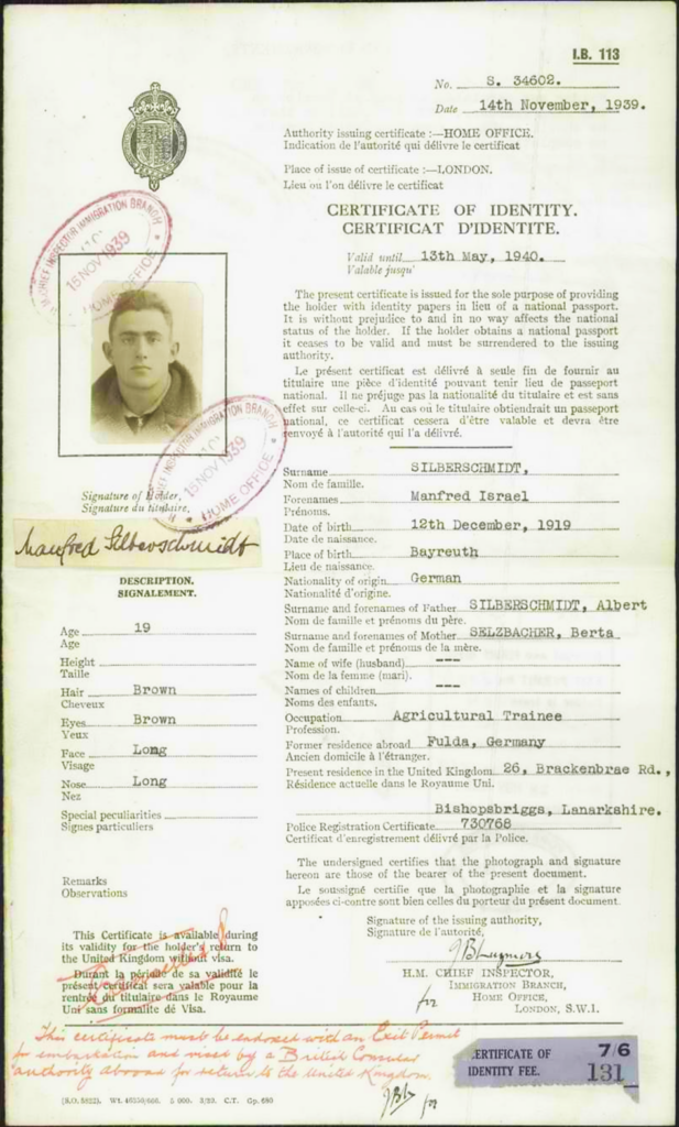 19.11.1939 Ausstellung eines Certificate of Identity in London