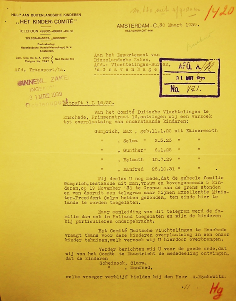 19.11.1938 Flucht der Eltern mit Max sowie den vier Geschwister nach Gronau, wo sie zunächst nicht einreisen dürfen. Vater Hermann schreibt ein Telegramm an Ministerpräsident Colijn; nach dessen Zustimmung können sie nach Enschede einreisen.