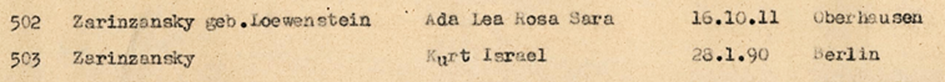Ada Lea Rose Löwenstein *16.10.1911 in Oberhausen; 3.3.1943 Auschwitz; oo Kurt Zarinzansky