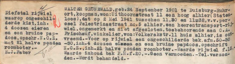 2.5.1941 Walter Grünewald meldet auf der Polizeiwache am Leidse Plein den Diebstahl eines Lastenfahrrades mit 21 Päckchen Butter und vier Dutzend Eier