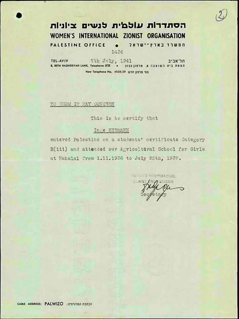 7.7.1941 WIZO Zertifikat über die Ausbildung