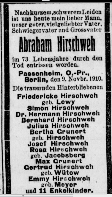 Vater Bernhard Hirschweh *15.3.1868 in Passenheim; ✡ 21.5.1939 in Berlin