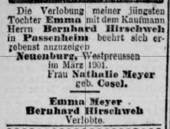 Hilde Hirschweh *14.6.1902 in Passenheim; ✡ vor 1945; oo Julius Saphirstein