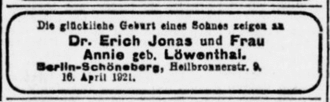 Vater Erich Jonas *23.8.1883 in Sagan; ✡ 25.11.1938 in Berlin