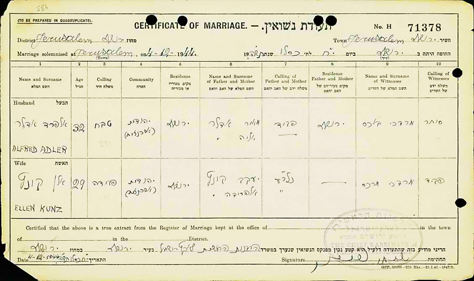 1944 Heirat mit Ellen Kunz in Jerusalem; ihre Eltern Jakob Paul Kunz und Frieda Weiss (1887-1940) sind bereits verstorben