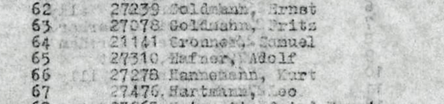 In Buchenwald erhielten einige Chaluzim aus Ellguth zunächst durch Entlassung von ASJ Häftlingen freigewordenen Nummern im Bereich 10000-11000, später erfolgte einen Umnummerierung auf Nummern um 27450; Adolf Hafner erhält die Nummer 27310