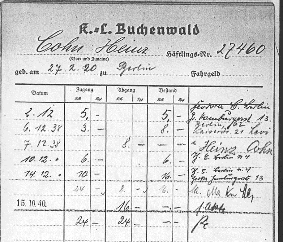 14.11.1938 Heinz Cohn eingewiesen als Aktionsjude in das KL Buchenwald; Häftlingsnummer 27460