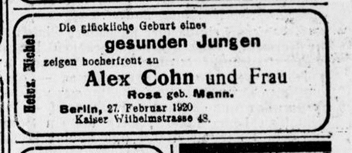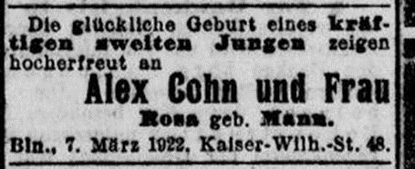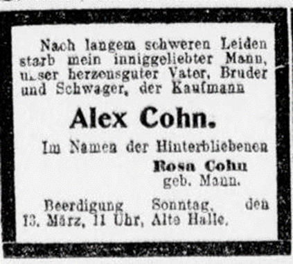 Vater Alex Cohn *1878; ✡ 11.3.1927 in Berlin