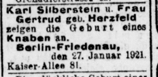 Vater Karl Silberstein *9.5.1875 in Posen; ✡ 17.1.1943 Theresienstadt