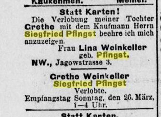 Vater Siegfried Pfingst *29.7.1883 in Bischofsburg; ✡ 9.10.1936 in Berlin