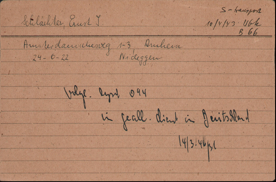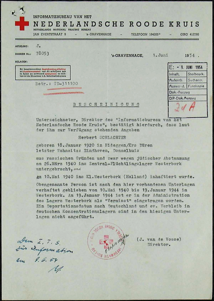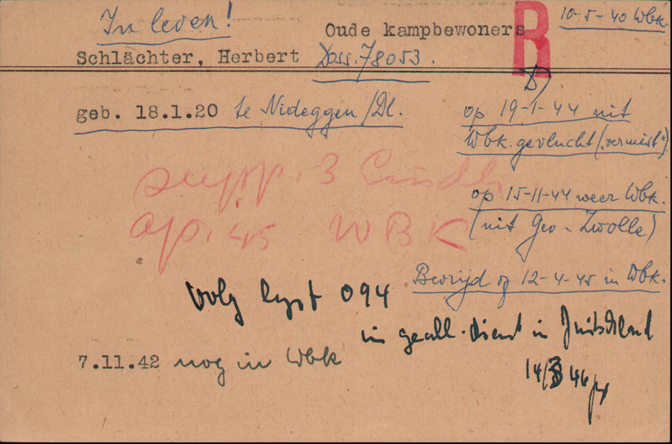 19.1.1944 gelingt Herbert Schlächter die Flucht aus Westerbork; er wird aber gefasst und im Gefängnis Zwolle inhaftiert.