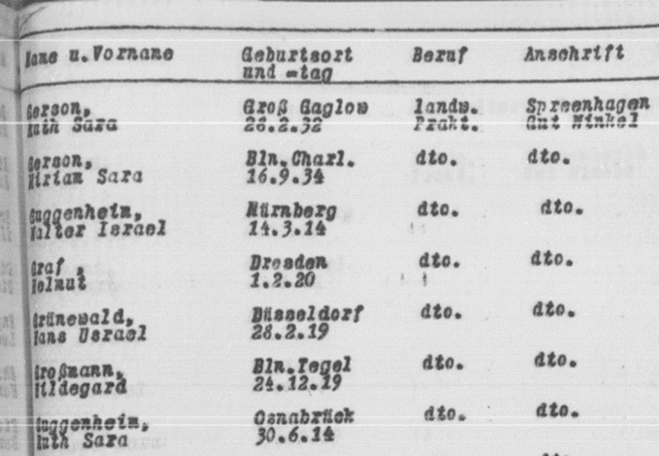 September 1939 Ruth und Walter Guggenheim auf der Bewohnerliste von Lehrgut Winkel