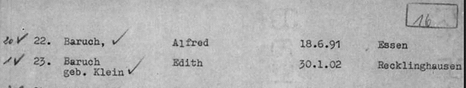 Heirat 1927 Alfred Baruch *18. 6. 1891 Essen, Kaufmann; ✡25.2.1943 im Ghetto Lodz