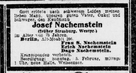 Vater Joseph Nachemstein *16.4.1856 in Strasburg; ✡2.2.1928 in Berlin