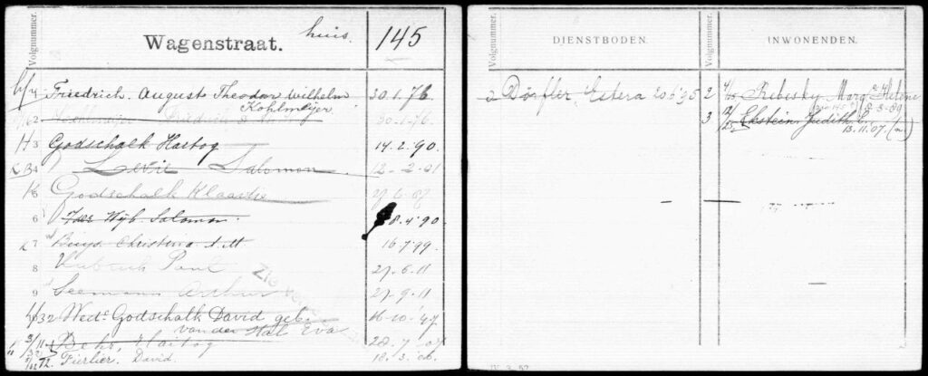 By searching for my own project about he jewish family called „Walg“ i was googling all the people who were living with Hartog Godschalk en Elizabeth Walg I came along this website. Estere Dorfler worked for the Godschalk family a while. That must be after 1924. She worked an lived at the Wagenstraat 145 in The Hague. For how long she worked for the family could not be determinated. She doesn’t come up in any othe household or home in the Netherlands. If you want the „House Card“ of Wagenstraat 145 where here name is at, you can email me.