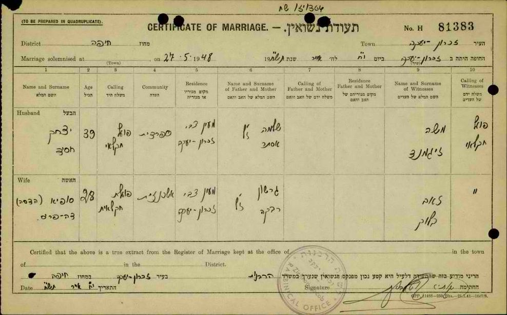 1948 Heirat in Zikhron Ya’akov mit Isaac Hassid; Name dann Hadassah Hassid