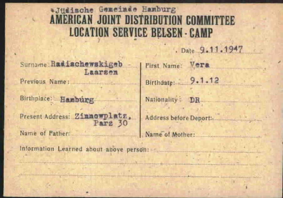 Wera Laarsen *9.1.1912 in Hamburg; ✡?; oo Erich Radischewski; oo Grossmann