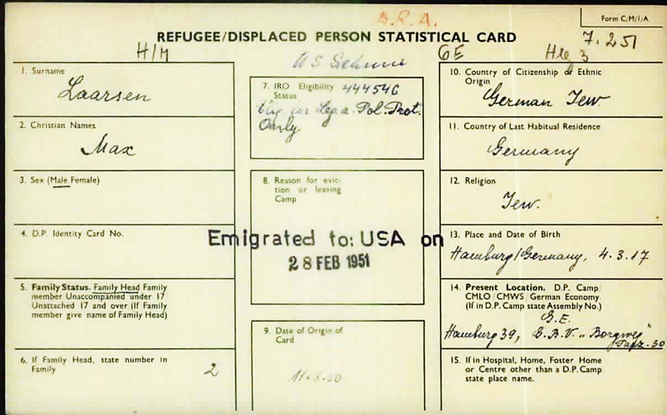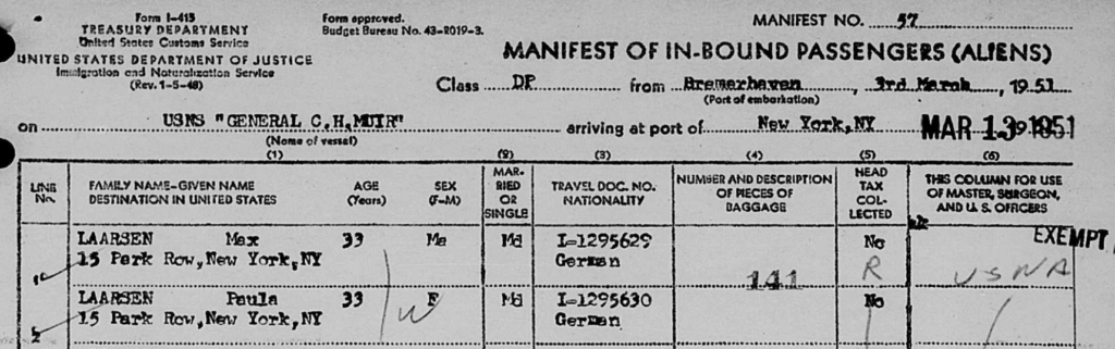 3.-13.3.1951 Emigration von Max und Paula Laarsen von Bremen auf der USS GENERAL C.H.MUIR von Bremen nach New York