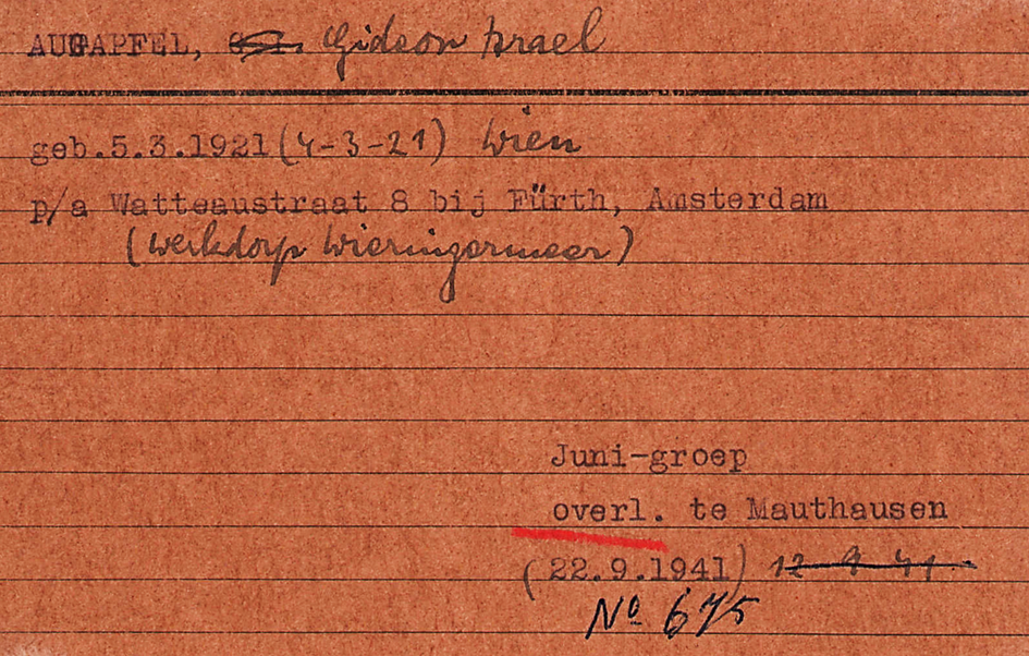 Sohn Gideon Augapfel *4.3.1921 in Wien; ✡22.9.1941 in Mauthausen