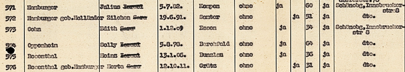 28.8.1942 Einweisung von Heinz und Hertha Rosenthal mit den Schwiegereltern Julius Hamburger und Cilla Holländer sowie Edith Cohn und Selly Oppenheim aus der Innsbrucker Straße 8 in das Sammellager Große Hamburger Straße