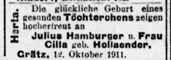 Heirat Hertha Hamburger *12.10.1911 in Graetz; ✡ September 1942 in Riga