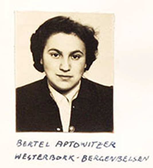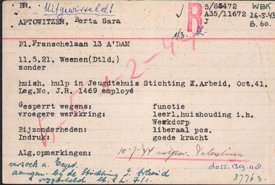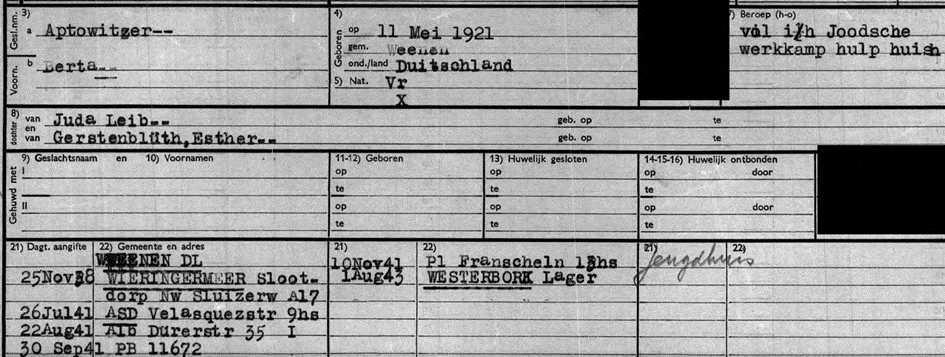 26.5.1943 die Bewohner des Jeugdhuis Franschelaan werden bei einer Razzia verhaftet und nach Westerbork deportiert; Berta Aptowitzer eingewiesen in das polizeiliche Judendurchgangslager zusammen mit Martha Eibschütz, Kurt Elias, Ruth Karlsberg, Eva Laufer mit Sohn Martin Laufer, Ernst Rosenbaum, Grete Schramm, Norbert Schweitzer, Herta Tombowsky und Herbert Tombowsky, Martin Uffenheimer, alle Baracke 60
