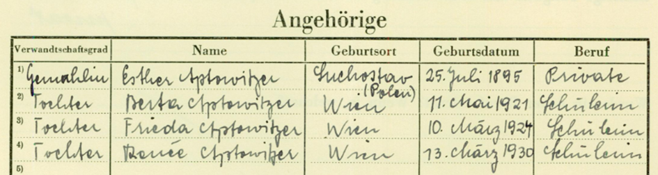 17.5.1938 Antrag des Vaters Juda auf Untestützung zur Emigration der ganzen Familie bei der Jüd. Kultusgemeinde Wien; Ziel Nordamerika oder auchg Süd-Amerika