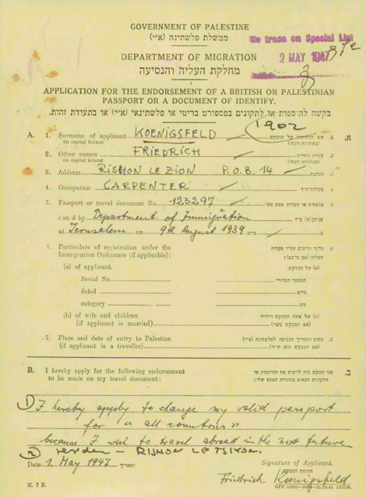 Einbürgerung in Palästina vor 1940; bereits 1940 tritt er als Bürge bei Einbürgerungen auf