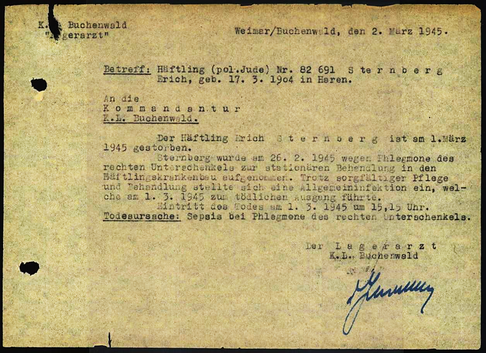 Unterschrieben ist seine Totenmeldung nicht von einem Arzt, sondern dem Häftlingspfleger Louis Gymnich (KPD, kommunistischer Lagerwiderstand); im Saal 61 wurden täglich bis zu 100 Schwerkranke mit Phenolinjektionen ins Herz getötet.