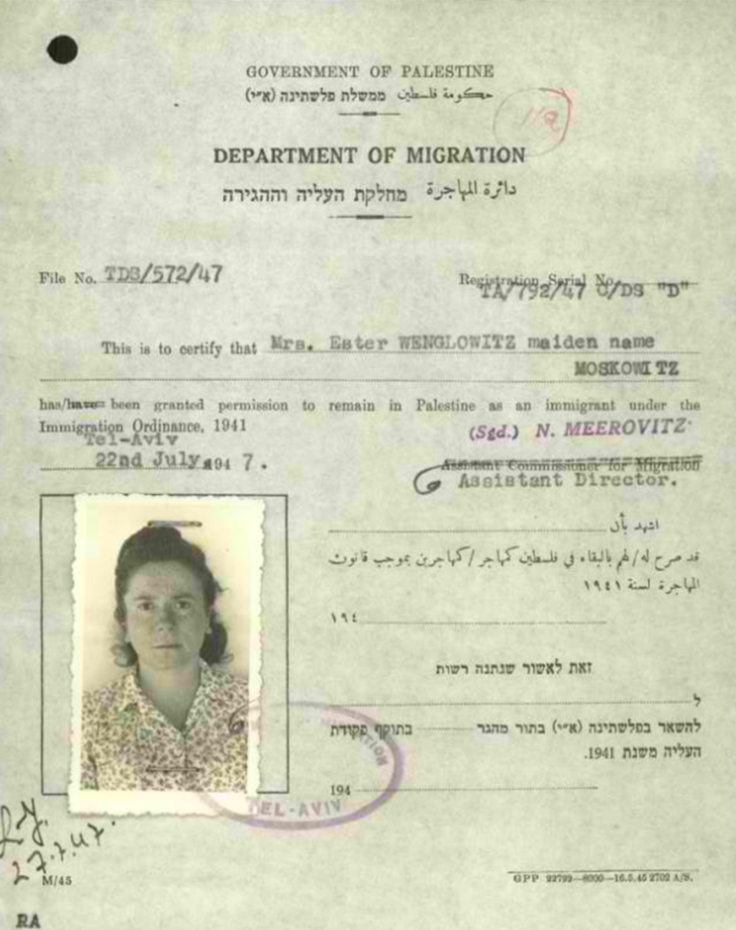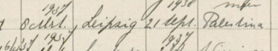 20.9.1937 Einreise des Ehepaars Wenglowitz in Haifa mit einem Arbeiterzertifikat des Hechaluz der Kategorie C/LS, wobei Elfriede als Ehefrau einreist (Kategorie D)