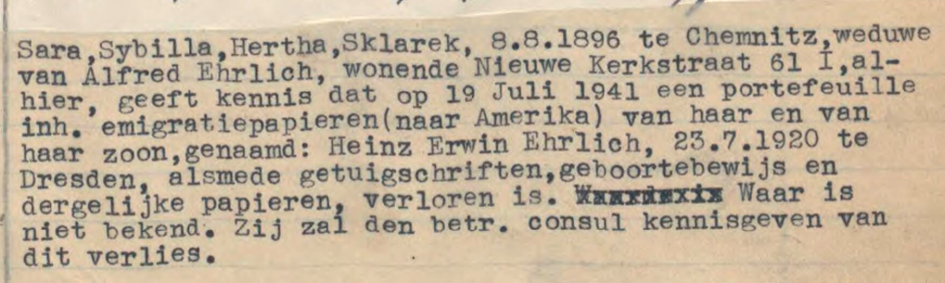 21.7.1941 Mutter Sybille meldet den Verlust von Auswanderungs-dokumenten, etc. auf der Wache Jonas Daniël Meyerplein in Amsterdam