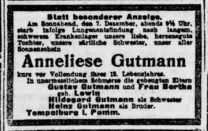 Anneliese Gutmann * Dezember 1906 in Tempelburg; ✡ 7.12.1918 in Tempelburg