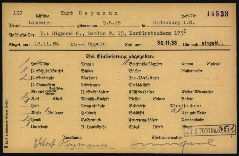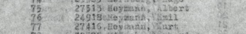In Buchenwald erhielten die Chaluzim aus Ellguth Häftlingsnummern um 27450, Kurt Heymann erst die Nr. 10523 und später die 27416.