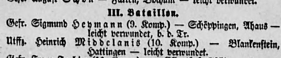 10.8.1915 Vater Sigmund, Gefreiter der 9. Kompagnie des III. Bataillon des Landwehr-Infanterie-Regiments 118, verwundet gemeldet in den Preußischen Verlustlisten