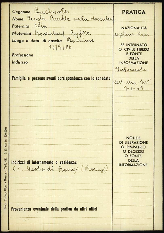 16.9.1940 beide Eltern vom Campo Internato Ferramonti in das Campo Internato libero Costa di Rovigo; in diesem Ort als freiem Lager lebte die Familie Buchaster mit 11 weiteren jüdischen Flüchtlingen