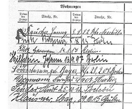 1935 in Berlin Schöneberg, Luitpoldstraße 24 mit zahlreichen weiteren Chawerim wie Kurt Rosenthal aus Herten; vermutlich zu einem Hachschara-Vorbereitungskurs zur Untermiete mit zahlreichen weiteren jüdischen Personen; Pension?