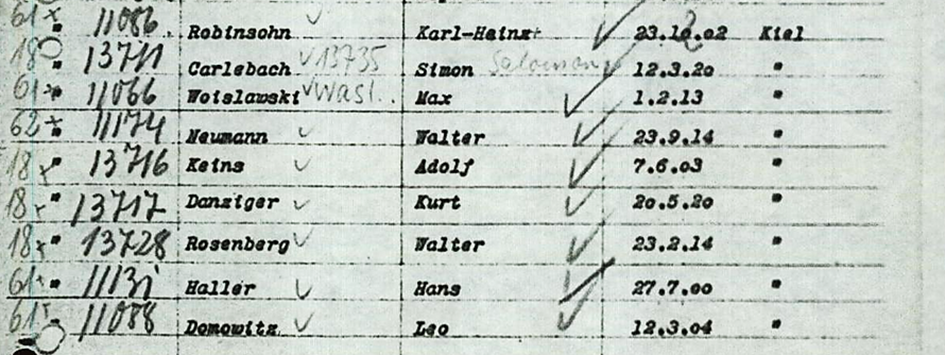 28.12.1938 Entlassung von Walter Neumann mit 14 jüdischen Gefangenen aus Kiel aus der „Schutzhaft“ im KL Sachsenhausen, davon zehn aus dem Gut Jägerslust.