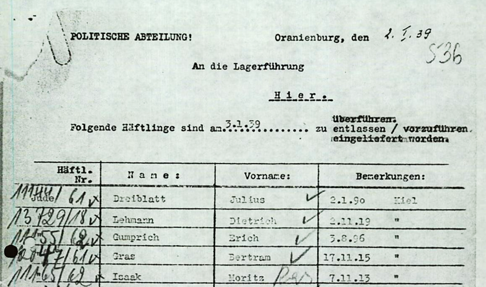 3.1.1938 Freilassung von Moritz Isaak mit weiteren acht Juden aus Kiel