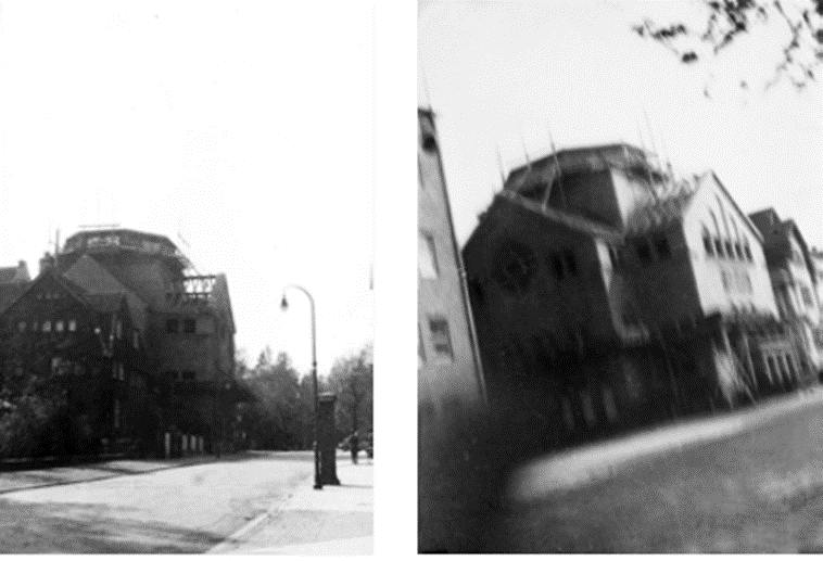 Moritz Isaak und Walter Neumann machen im Januar 1939 vom Hohenzollernpark aus heimlich Aufnahmen der gegenüberliegenden Synagoge.