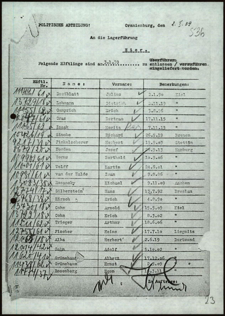 28.12.1938 Entlassung von 14 jüdischen Gefangenen aus Kiel aus der „Schutzhaft“ im KL Sachsenhausen, davon zehn aus dem Gut Jägerslust.