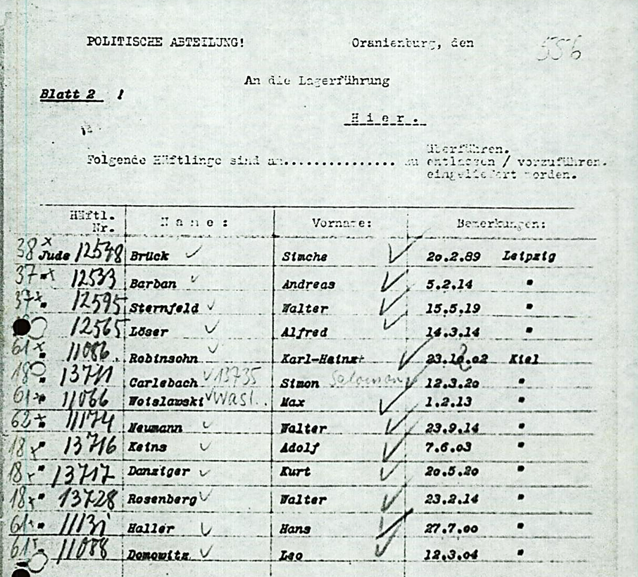 28.12.1938 Entlassung von 14 jüdischen Gefangenen aus Kiel aus der „Schutzhaft“ im KL Sachsenhausen, davon zehn aus dem Gut Jägerslust.