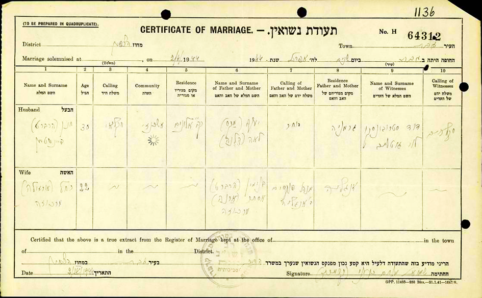 Heirat 2.4.1944 Ursula Rachel Marcuse *5.8.1921 in Potsdam; ✡5.3.1889 in Kibbuz Alonim