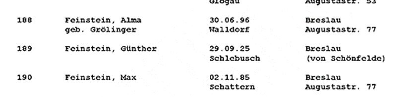 13.4.1942 Deportation von Vater Max mit Stiefmutter Alma und Halbbruder Günther aus Breslau ins Ghetto Izbica; Bruder Günther zuvor aus Schönwalde zurückgeholt