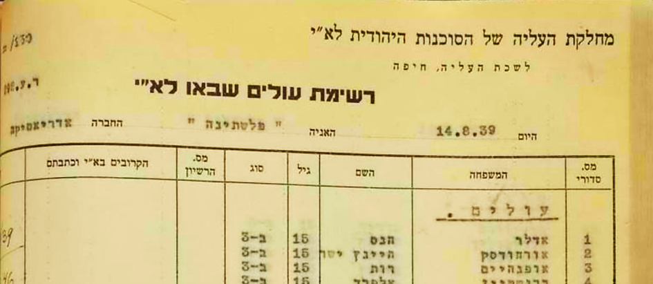 14.8.1939 Ankunft von Hans Günter Adler auf der SS PALÄSTINA mit einem Studentenzertifikat der Jugendalija der Kategorie B(III)